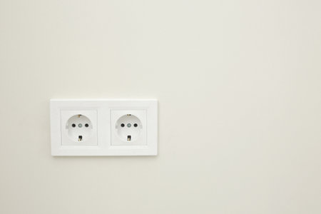 Modern double electrical power socket plug outlet on white concrete wall background with copy space.