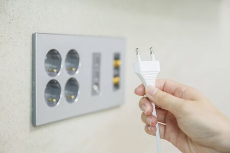 Unplug or plugged install on light brown wall, electric plug gray color with copy space