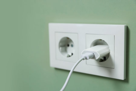 Close-up of an electrical power outlet (Type F/G/B socket) on a clean wall. Minimalist power terminal representing modern home connectivity, electricity supply, and energy infrastructure