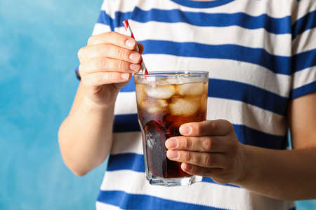 Female hands holding a glass with cola and tubule