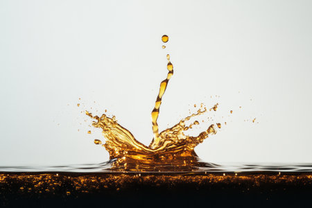 Golden liquid splashes upward, creating a series of striking droplets against a smooth water surface, showing the beauty of motion and fluid dynamics.
