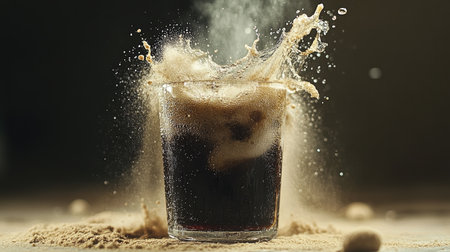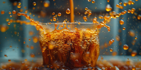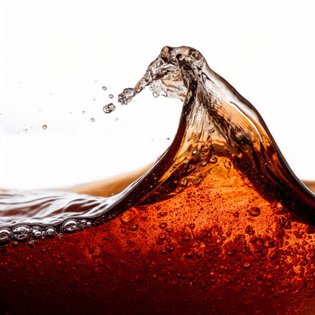 A close-up view of bubbles splashing in a fizzy brown beverage with an energetic vibe