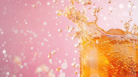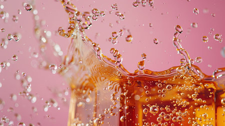 Close-up of iced tea splashing, with droplets in the air on a pink background