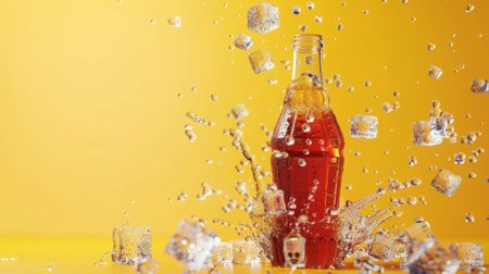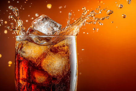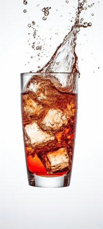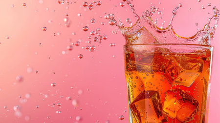 A vibrant image of a soft drink splashing in a glass filled with ice cubes. The colorful background highlights the refreshing beverage, ideal for summer themes.
