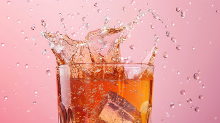 Iced tea splashing out of a glass, droplets frozen in motion on a pink backdrop