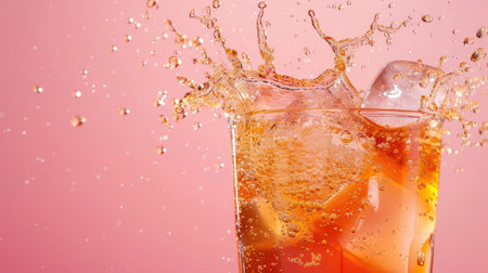 Refreshing iced tea in a glass, ice splashing out against a pink backdrop