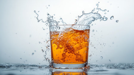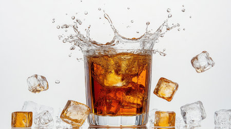 A dramatic splash of a drink with ice cubes against a white background, capturing the refreshing moment