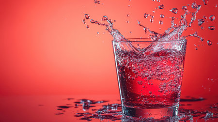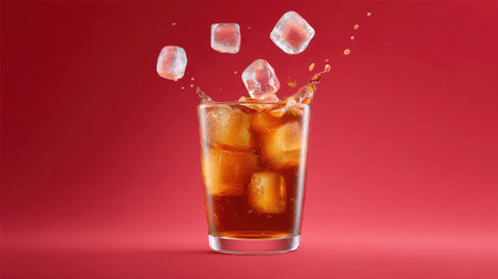 A vibrant glass of cold beverage with ice cubes and splashes creates a refreshing scene on a bright red background, ideal for summer drink marketing and advertising.