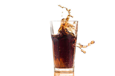 A glass of cola overflowing with a dramatic splash, bubbles rising energetically, set against white.