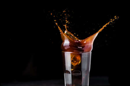 Cold glass with whiskey splash on a black background. Dark alcohol beverage.