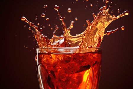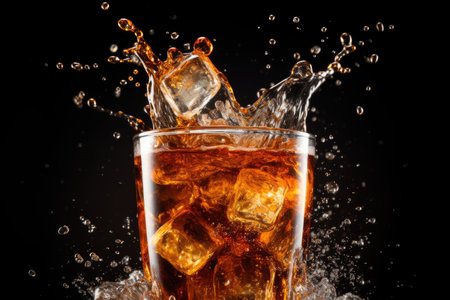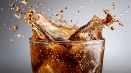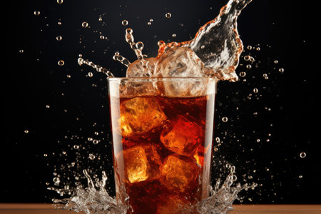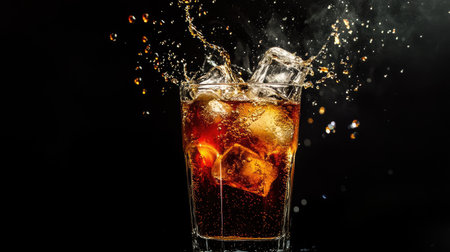 A captivating splash of a refreshing dark drink with ice cubes, showcasing dynamic movement and vibrant colors, perfect for beverage marketing or lifestyle themes.