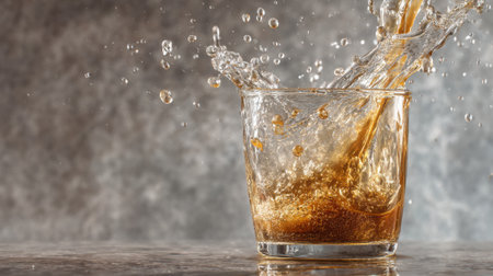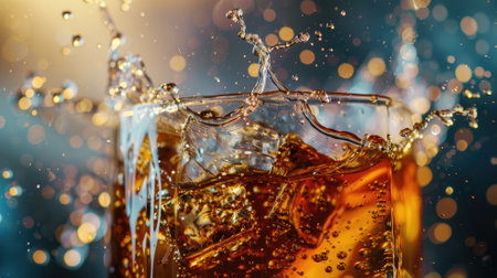 A captivating close-up of a refreshing beverage being poured over ice. The glass showcases sparkling bubbles and splashes, creating an enticing visual perfect for beverage-related themes.