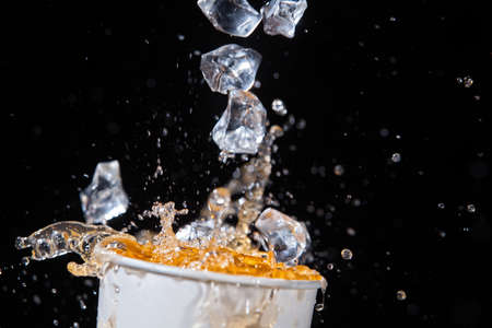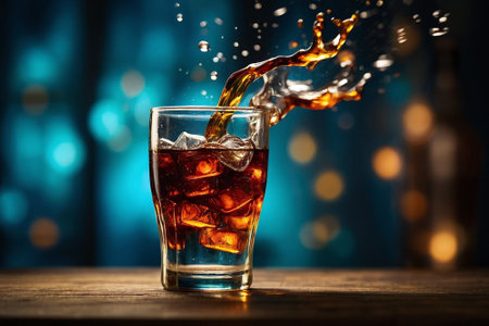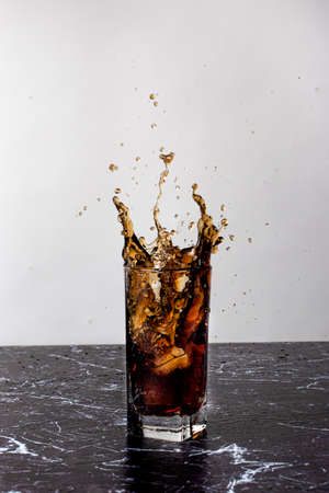 A glass of soda with ice cubes in it is splashing out of the glass. Concept of fun and excitement, as if the soda is being poured out of the glass with great enthusiasm