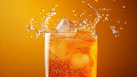 A refreshing sparkling orange drink with ice in a glass, surrounded by droplets and a vibrant, festive atmosphere.
