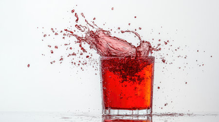 A splash of red fruit juice with droplets flying out of a glass, set against a clean background