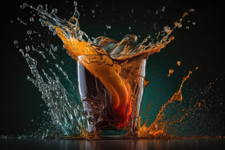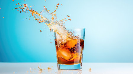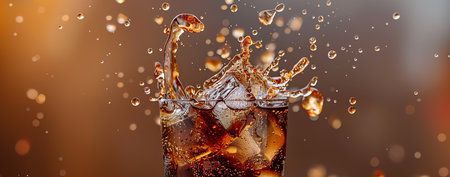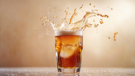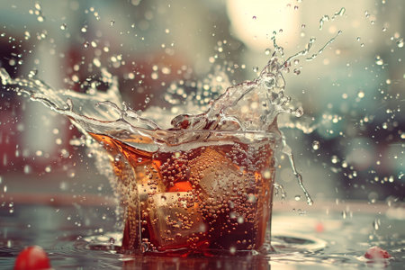 A glass of soda with ice cubes in it is splashing water everywhere. The image has a playful and fun mood, as if the soda is having a good time splashing around