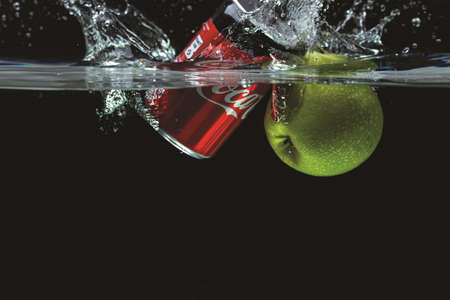 Close up view of cans of Coca Cola and apple falling into water with spray. Sweden. Uppsala. 03.23.2021.