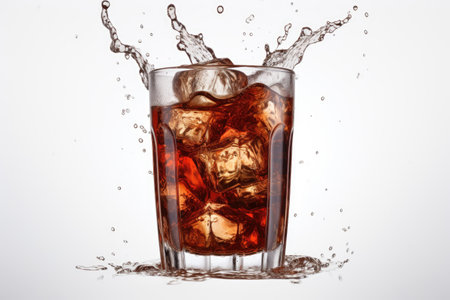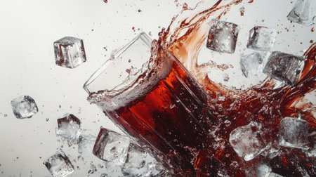 A dynamic image of fresh cola splashing out of a tilted glass, with ice cubes scattering on white.