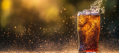 A glass filled with fizzy drink splashes as ice cubes collide with the liquid. The warm afternoon light enhances the refreshing scene, inviting enjoyment.