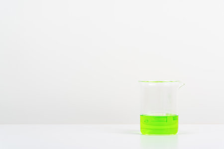 AI Generated. closeup of a glass beaker filled with bright green liquid in a laboratory setting with a blue background and a moody atmosphere
