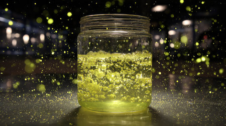 A captivating close-up of a clear jar filled with bright yellow liquid, showcasing lively bubbles and sparkles, set against a soft focus background.