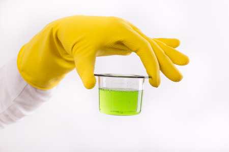 Hand with rubber glove holding dosage cup with green detergent against white background. Safety cleaning products usage indoor