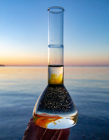 A scientist holds a flask containing a complex chemical reaction against a serene sunset over the ocean.