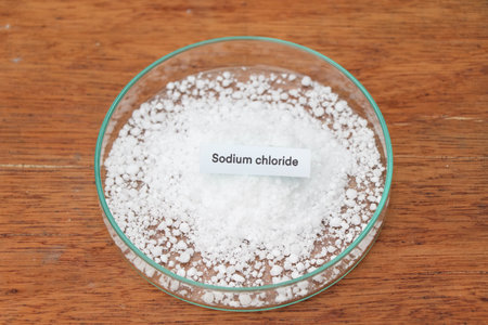 sodium chlorite being analyzed in the laboratory inside the petri dish. Chemical compound for industrial use