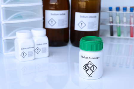Sodium hydroxide in bottle, chemical in the laboratory and industry