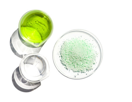 Ferrous Sulfate in Chemical Watch Glass place next to Iron (II) sulfate liquid in Beaker. Close up chemical ingredient on white laboratory table. Top View