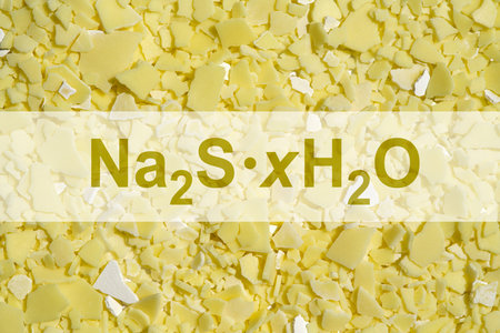 Sodium sulfide flake with chemical formula. Chemical used in the pulp and paper industry, water treatment, textile industry, and various chemical manufacturing process.