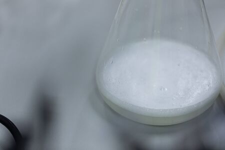 Closeup chemical ingredient on white laboratory table. Di-Ammonium Phosphate in chemical watch glass place next to beaker with alcohol and Volumetric flask. Top View