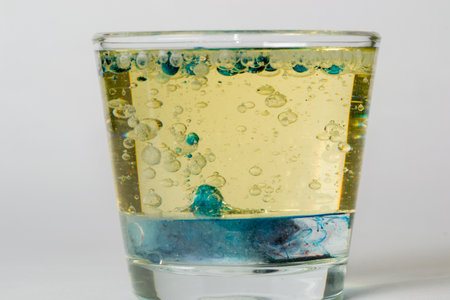 Bubbles rise in a clear glass container as a blue substance mixes with liquid showcasing a vibrant chemical reaction filled with texture and color.