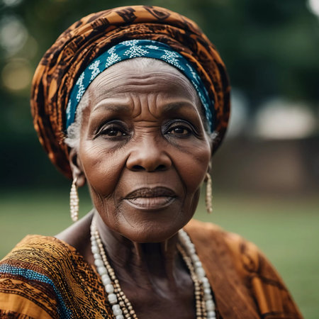 A graceful elder woman adorned in colorful traditional clothing and an ornate headwrap stands confidently amidst a sunlit background, radiating wisdom and heritage.