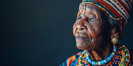 Elderly woman in colorful traditional beadwork gazing serenely into the distance against a dark background, reflecting wisdom and cultural heritage