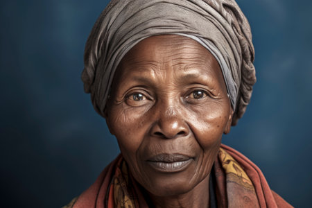Portrait of an elderly African woman in traditional attire on a black background, close-up.