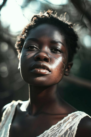 Close-up of pensive young African female face in sunlight.