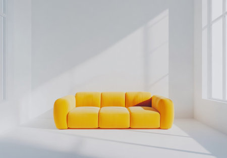 Modern living room with a yellow sofa and white walls, no people, minimalist interior design concept, high-resolution photography, insanely detailed, fine details, stock photo, professional color grading, hyper-realistic. --ar 43:30 --v 6.1 Job ID: d9a8f423-93e4-42aa-906e-91f67c755a39