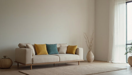 Minimalist interiors design with a sofa, natural elements decor and copyspace for text