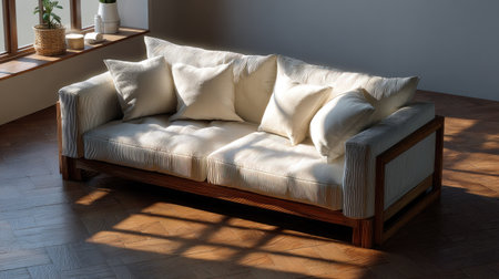 A stylish and inviting modern sofa features soft cushions, perfect for creating a cozy atmosphere in a sunlit living room setting. The wooden frame adds elegance.