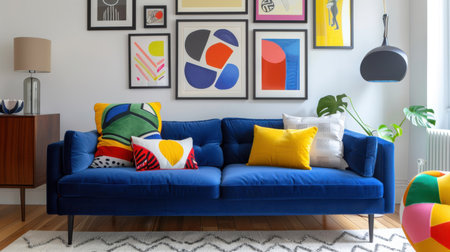 Discover a cozy modern living room featuring a blue sofa adorned with vibrant pillows and captivating wall art. This inviting space combines style and comfort, making it perfect for relaxation and creativity.