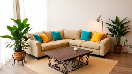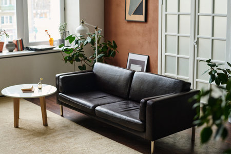 Interior of modern living room with sofa, coffee table and plants