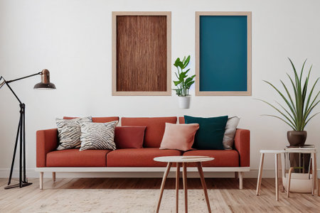 mock up poster frame in boho interior background, wooden living room design, Scandinavian style. Generative AI illustration