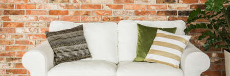 White sofa with pillows against brick wall in modern interior