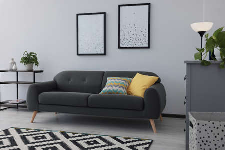 Beautiful living room interior with stylish gray sofa