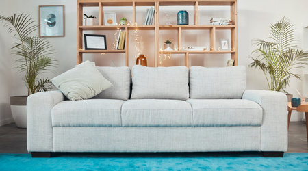 Interior design, room and furniture with a sofa in the living room of a luxury, modern and empty home. Real estate, seating and wealth with a couch in an apartment for accommodation or lifestyle