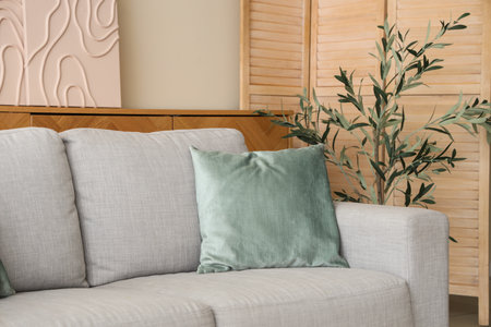 Interior of light living room with gray sofa, pillow and olive tree, closeup