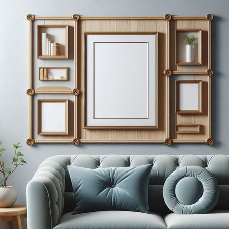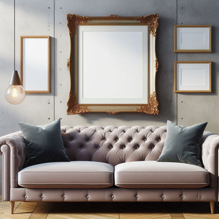 Living room interior with sofa, coffee table and picture frames on wall