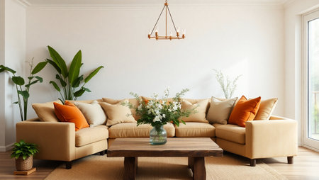 Bright living room interior with plants and natural light