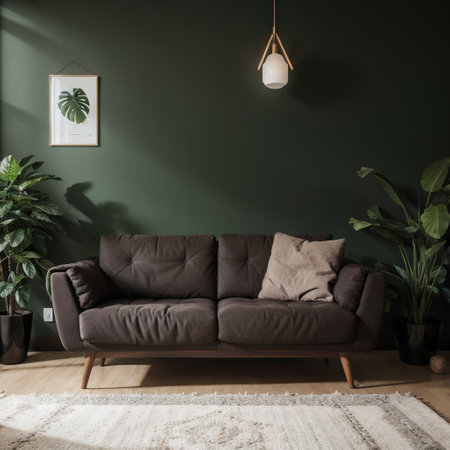 Luxury modern living room interior dark green brown wall modern sofa with armchair and plants